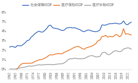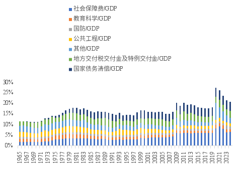 从各项支出占GDP的比重看,强制性支出占GDP的比重从1962年的5%明显上升至2024年的14%,2020年最高达21%;自由裁量支出从冷战背景下超过10%的高点降至90年代末的6%左右水平,2010年前后由于反恐战争又阶段性上升至9%左右,目前回落至6%;利息支出受债务绝对规模增长和利率水平影响,目前已超GDP的3%。