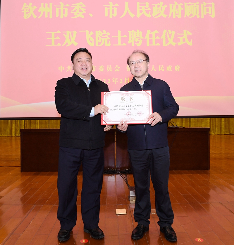 当前,钦州正大力实施“钦聚英才”计划,加快建设西部陆海新通道战略枢纽人才发展先行区,亟需高新技术、高端人才的支撑。王双飞院士受聘为钦州市委、市人民政府顾问,聘期3年。此次聘任,是王双飞院士首次受聘为广西地级市委、市人民政府顾问。聘任期间,王双飞院士将围绕落实钦州“建大港、壮产业、造滨城、美乡村”四轮驱动战略、建设平陆运河经济带、科技人才培养、科研技术开发和成果转化等方面与我市展开合作。