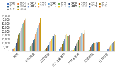 近年来,禁止违规新建楼堂馆所、提高政府投资效益等推动财政支出逐步从建设类逐步转向民生类。从一般公共预算支出看,教育、社保就业等支出规模持续增长,增速和绝对规模都高于城乡社区事务、农林水事务、交通运输等支出。